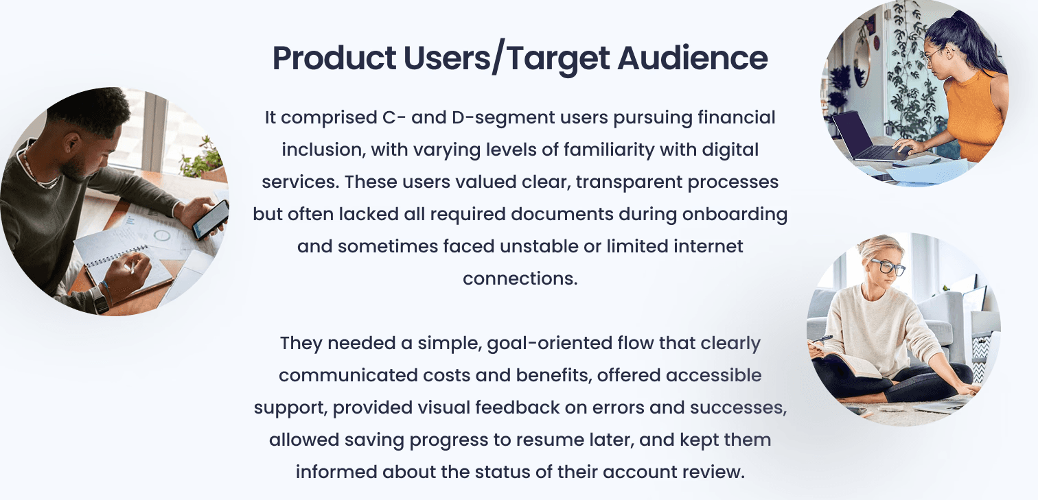 Benchmarking C/D-focused fintechs revealed standard patterns this product was missing: progress indicators, contextual help, and save-and-resume functionality and essential for users with intermittent connectivity and shared devices.