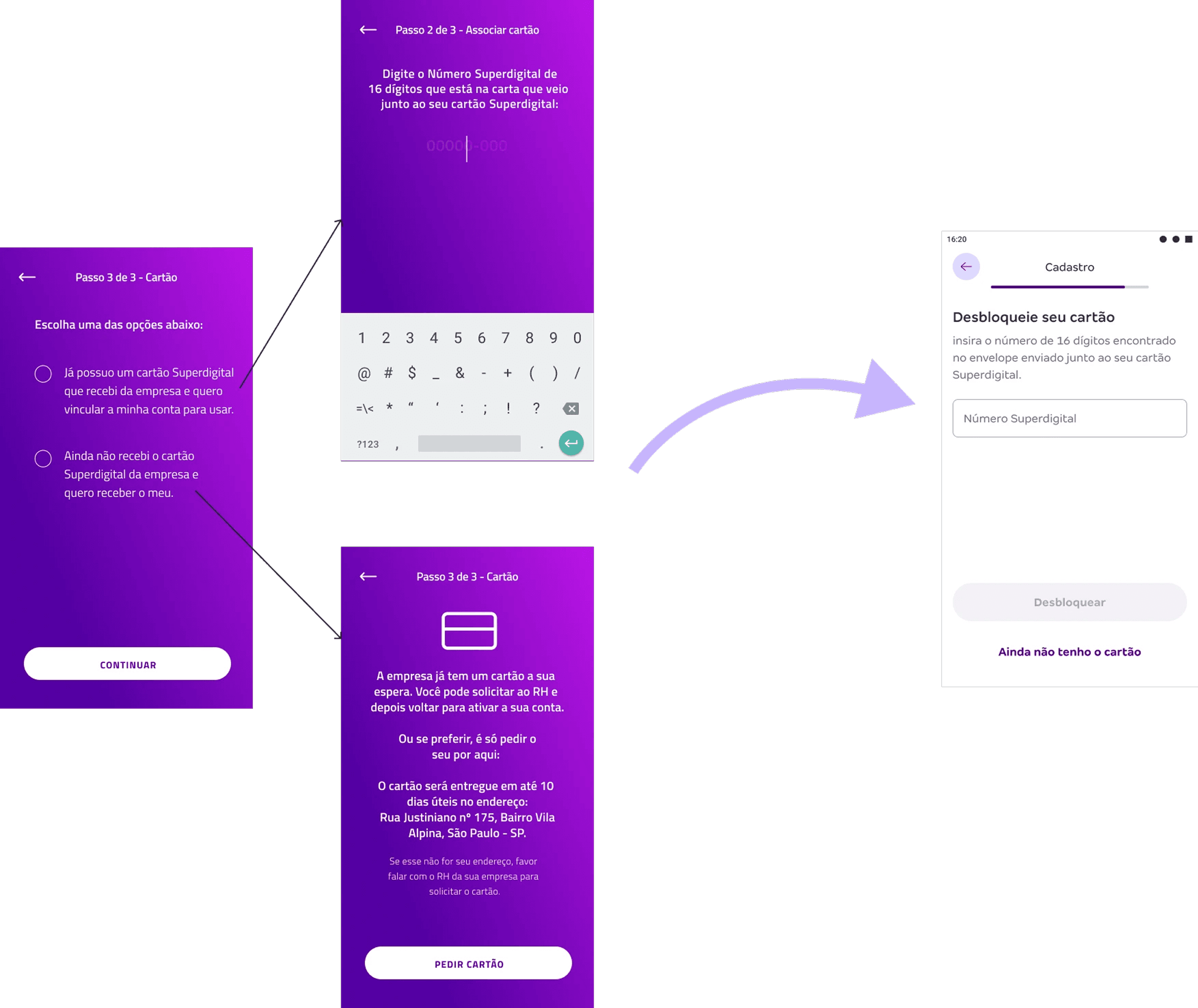 Card Issuance Optimization: Simplified card-association step replacing multi-option chooser with single information-request screen featuring clear "Request Card" option only for users who haven't previously requested, eliminating unnecessary issuance costs.